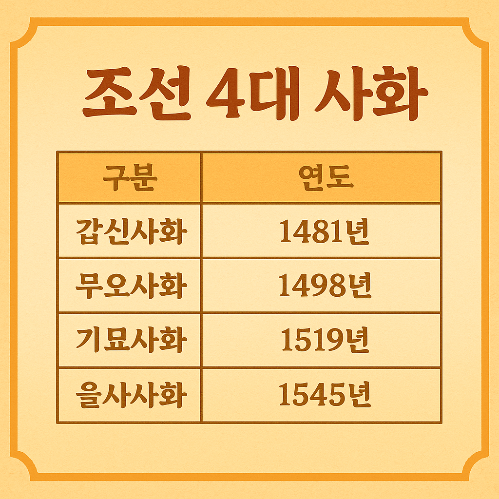 ‘사화’란 조선 시대에 사림파가 정치적 반대 세력으로부터 탄압을 받아 피해를 입은 사건을 말합니다. 15세기 말부터 16세기 초까지 총 네 번의 사화가 있었는데, 그 시작이 바로 1498년의 갑신사화였습니다. 이후 무오사화(1498), 기묘사화(1519), 을사사화(1545)가 이어졌습니다.