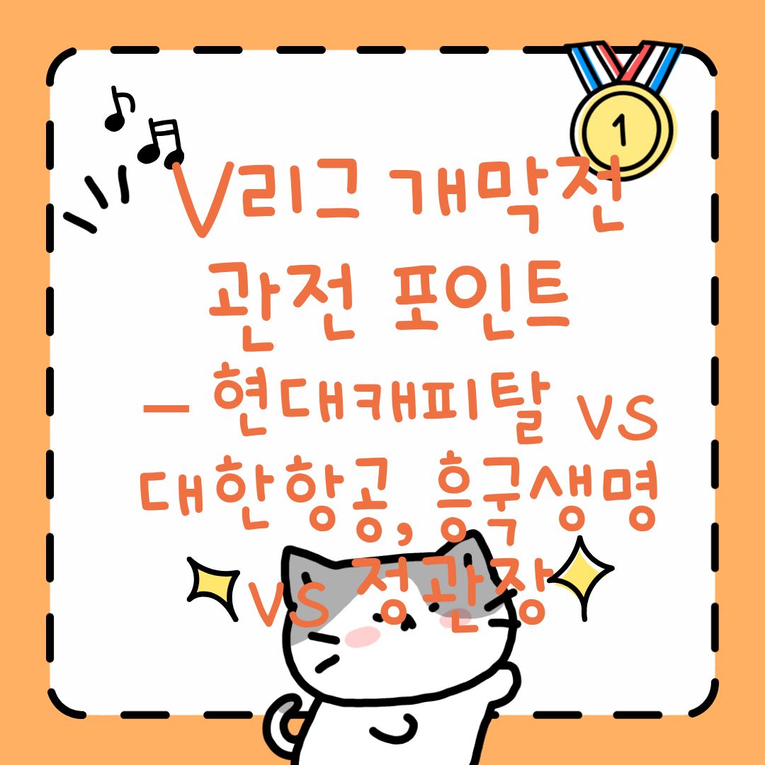 2025–26 V리그 개막전은 현대캐피탈 vs 대한항공, 흥국생명 vs 정관장의 맞대결로 시즌 시작부터 큰 화제를 모으고 있습니다. 우승후보와 신생팀, 베테랑과 루키가 맞붙는 개막전은 배구 팬들에게 최고의 볼거리를 제공할 것입니다. 티켓팅과 중계 채널을 미리 확인하고, 올 가을 배구장을 가득 채울 함성의 주인공이 되어보세요!